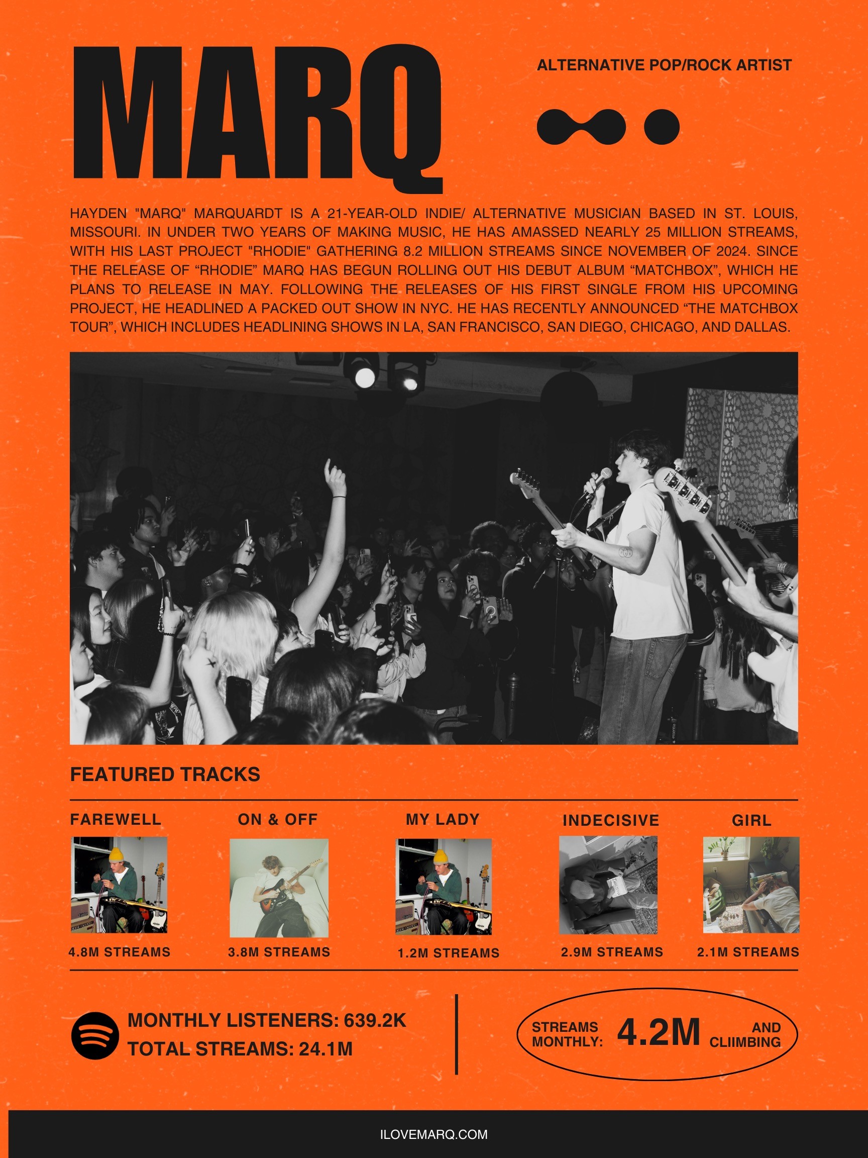 HAYDEN "MARQ" MARQUARDT IS A 22-YEAR-OLD INDIE/ ALTERNATIVE MUSICIAN BASED IN ST. LOUIS, MISSOURI. IN UNDER TWO YEARS OF MAKING MUSIC, HE HAS AMASSED NEARLY 60 MILLION STREAMS, WITH HIS LAST PROJECT "matchbox" and most recent singles "i didnt know'" and "holdin up", he has been reshaping his sound and direction.